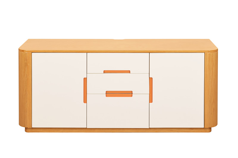 電視柜 基材:為實(shí)木白蠟?zāi)究蚣芙Y(jié)構(gòu),臺(tái)面多層板貼白蠟?zāi)酒ぁ?接觸面安全圓角,減低碰撞傷害,條狀暗拉手,抽面板用不同的色彩,是為了突出不同的作用。