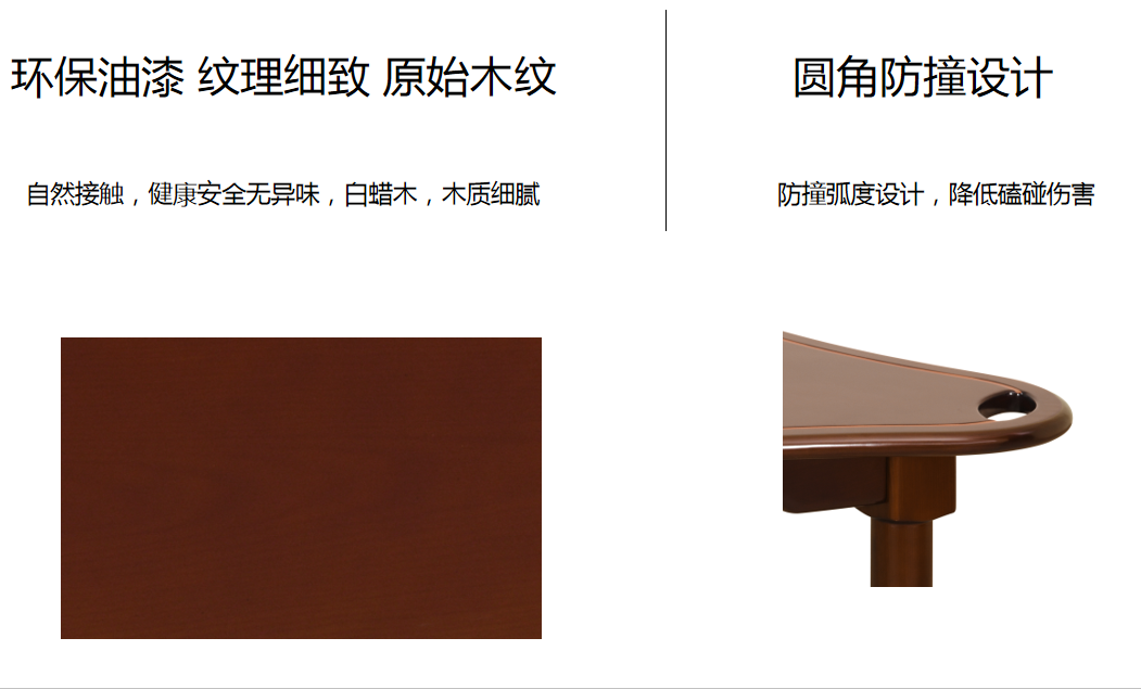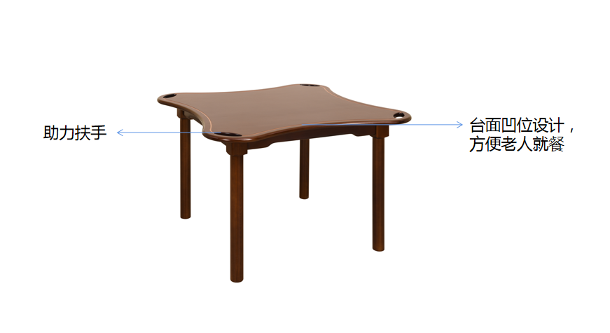 餐桌 基材:為實木白蠟?zāi)究蚣芙Y(jié)構(gòu) 臺面凹位設(shè)計,便于輪椅長者就餐 四角設(shè)有助力拉手孔,便于借力 桌角大圓角設(shè)計,減低碰撞傷害,拆裝結(jié)構(gòu),便于運輸。