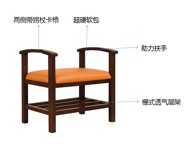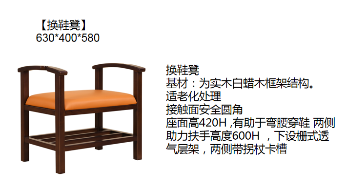 換鞋凳 基材:為實木白蠟木框架結構。 適老化處理 接觸面安全圓角 座面高420H ,有助于彎腰穿鞋 兩側助力扶手高度600H ,下設柵式透氣層架,兩側帶拐杖卡槽