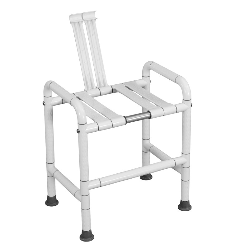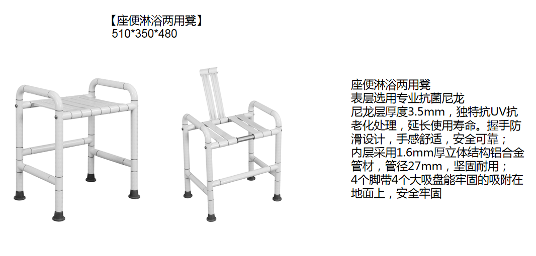 座便淋浴兩用凳 表層選用專業抗菌尼龍 尼龍層厚度3.5mm,獨特抗UV抗老化處理,延長使用壽命。握手防滑設計,手感舒適,安全可靠; 內層采用1.6mm厚立體結構鋁合金管材,管徑27mm,堅固耐用; 4個腳帶4個大吸盤能牢固的吸附在地面上,安全牢固