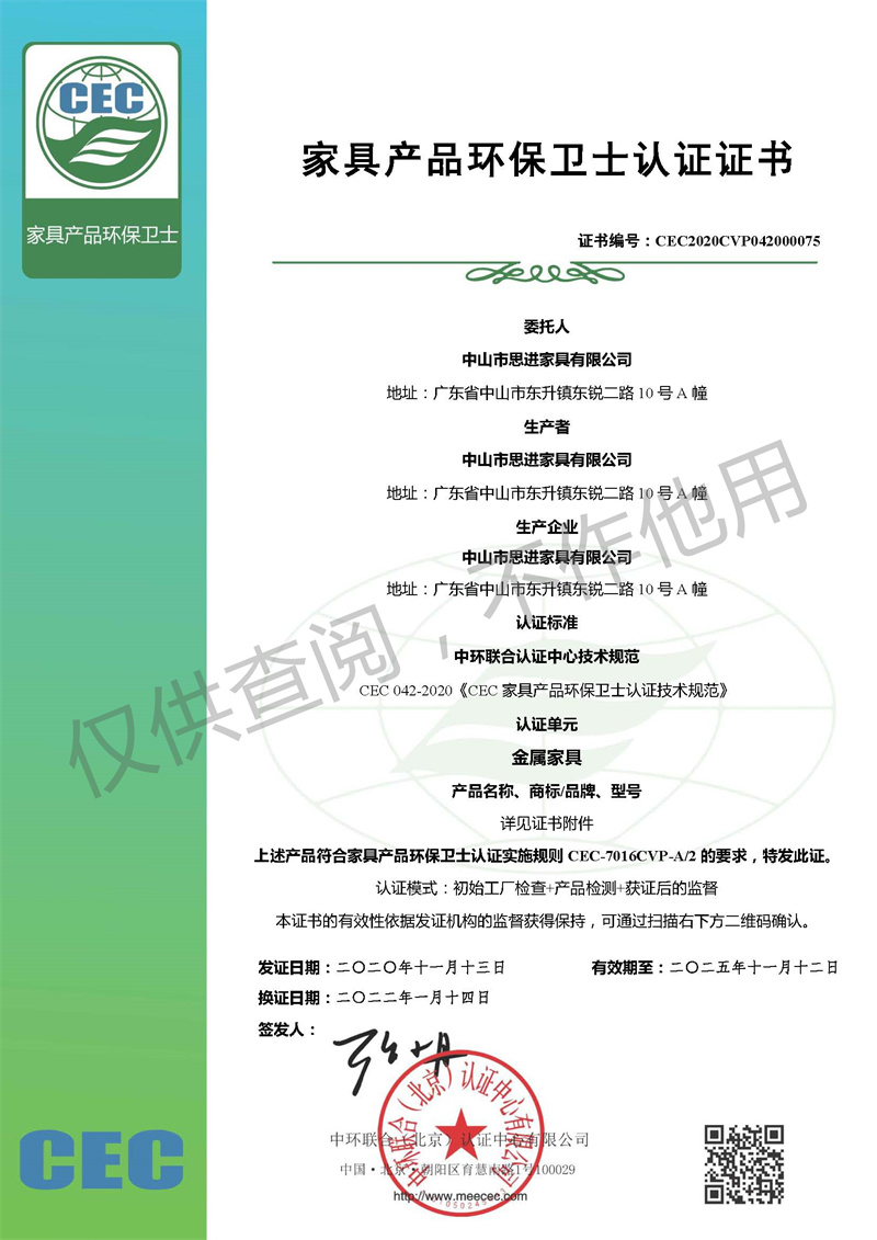 家具產品環保衛士認證證書-金屬家具
